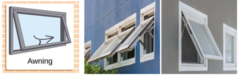 They are hinged at the top and open outward from the bottom. Unlike hoppers that open inward, they tilt outward strictly from the top. Awning windows are so-called because they create an “awning” when opened, which prevents rain from coming into the room and yet allows fresh air in.